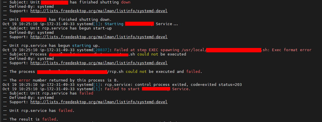 Failed at step EXEC spawning 경로/이름.sh: Exec format error 오류는 작성한 .sh 파일 작성이 잘못돼서다.