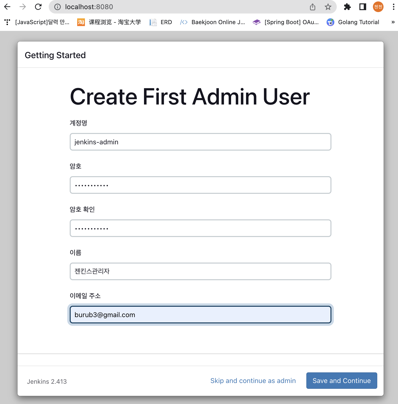 7. 단계 5의 화면에서 비밀번호를 입력하고 install suggested plugins를 누르고 설치가 완료되면 아래와 같이 admin user 계정을 생성하는 페이지가 나온다.